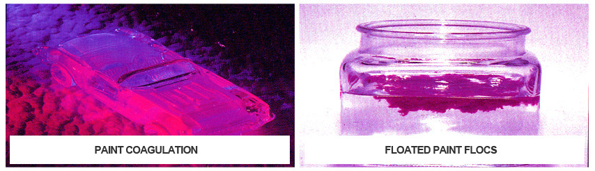 is a metal free all organic formulation of cationic polymers for use in coagulating paint solids in recirculating paintbooth systems. Use of the product will prevent paint build up that can clog pipework, water curtains and pumps. After coagulation, the paint flocs are floated using a floater product.
